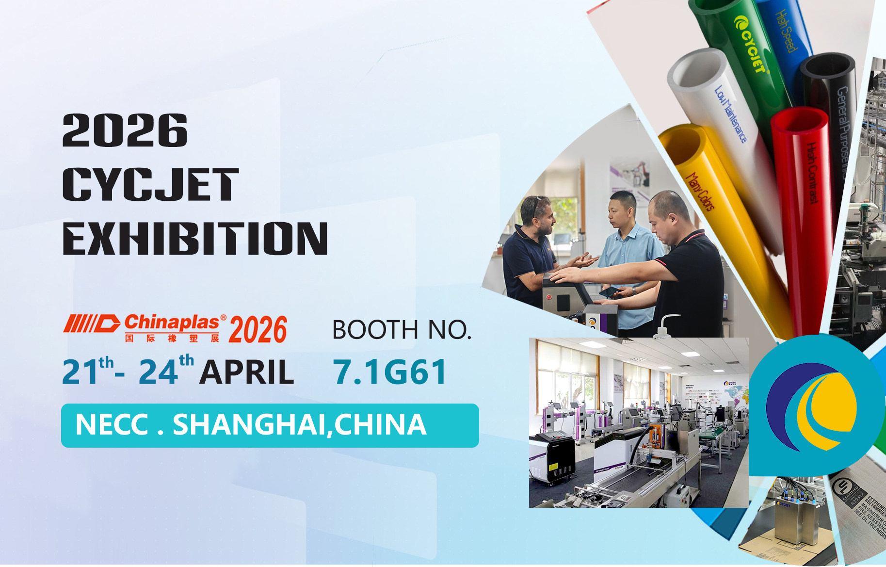 At CHINAPLAS 2026, CYCJET is honored to meet you once again.As one of the world's most influential trade shows for the rubber and plastics industry, this event will bring together industry companies and professional visitors from around the world. We sincerely invite our global partners, customers, and industry friends to visit CYCJET's booth 7.1G61 to exchange ideas on advanced inkjet printing and marking technologies.