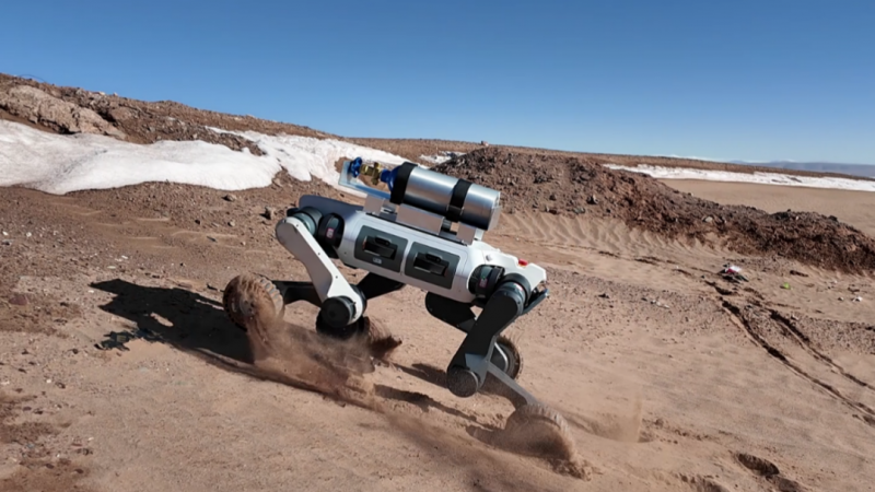 DEEP Robotics LYNX M20 Wheeled-Legged Robot Carrying an Emergency Oxygen Cylinder While Climbing Desert Dunes on the Hoh Xil Plateau