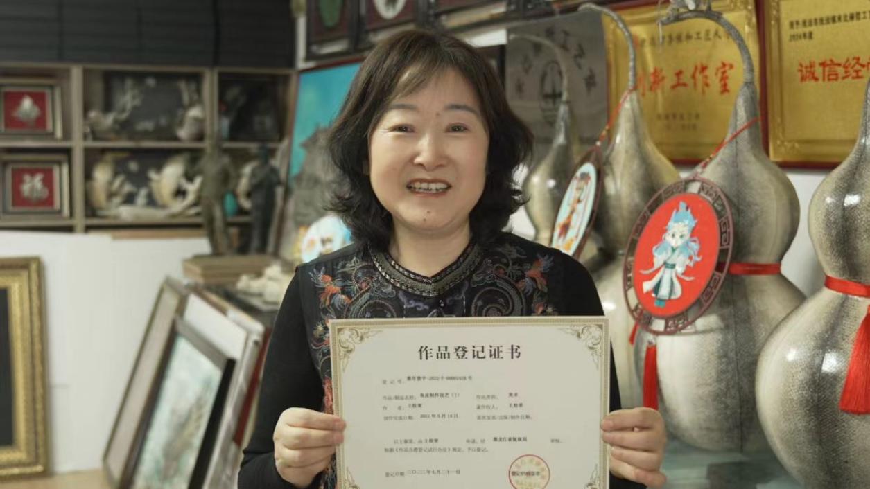 Three hundred kilometers away in Fuyuan, Wang Guirong, another provincial-level inheritor of Hezhe fish-skin craftsmanship, is busy completing a batch of orders with her apprentices. “These 27 copyright certificates are our confidence,” she says, gesturing toward a row of framed registrations beside the “Heyi” trademark on the studio wall. From mastering fish-skin processing techniques to collaborating with universities on cloisonné fish-skin art, copyright protection has allowed her to innovate with greater assurance.