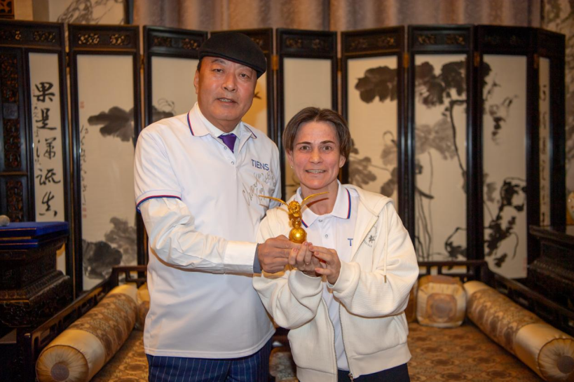 Mr. Li Jinyuan, Chairman of the Board of Directors of TIENS Group, and Olympic Champion Ms. Oksana Alexeyevna Chusovitina