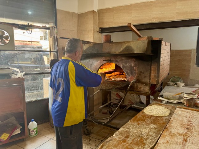 ‘Alhamdullilah,nothing was damaged,’ he confirms,while loading the oven with Lebanese flatbread to bake.